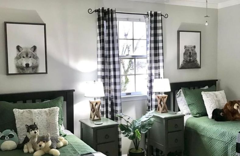 Forest green coverlets paired with striking black and white buffalo check blankets ground this twin bedroom in a cozy, woodland-inspired theme.