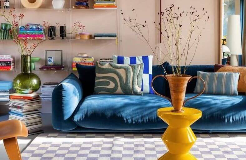 Bold Blue Sofa, Checkerboard Rug, and Eclectic Decor