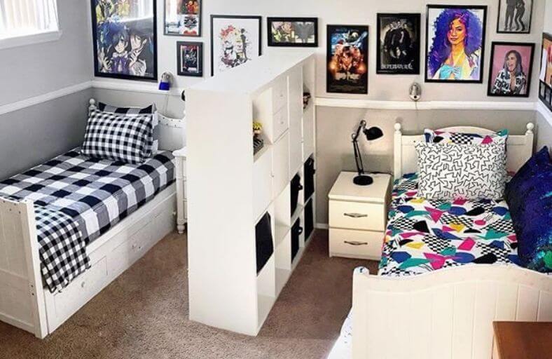 The white wooden furniture keeps the aesthetic clean and bright, allowing the distinct bedding patterns and vibrant gallery wall art to define each side’s unique personality.