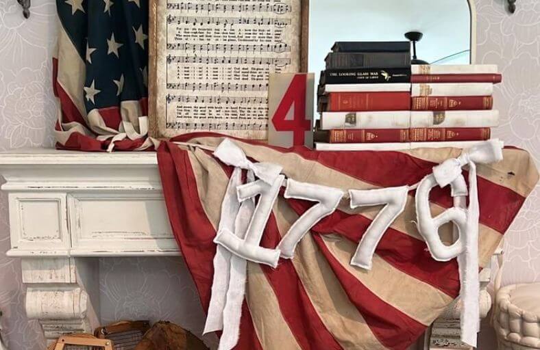 A festive “1776” banner made of white fabric adds a whimsical touch, while a rocking horse with a white ribbon completes the Americana charm.