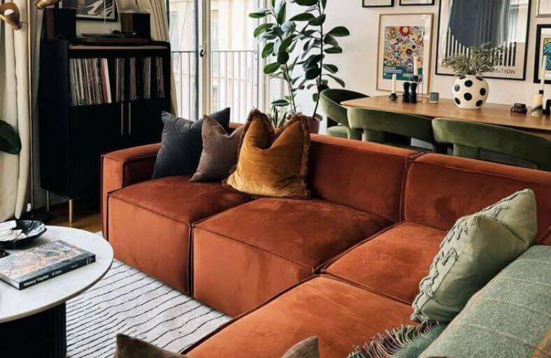 A deep terracotta velvet sectional anchors this space, offering a bold yet sophisticated focal point that radiates warmth and comfort.