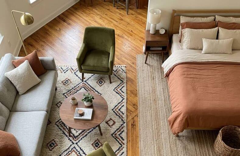 For example, a plush rug under your bed marks the “sleeping quarters,” while a different texture under your coffee table defines the “social zone.”