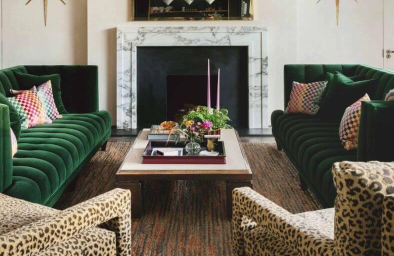 Deep emerald velvet sofas anchor this sophisticated living space, providing a lush, saturated foundation that balances the playful energy of the leopard print armchairs in the foreground.