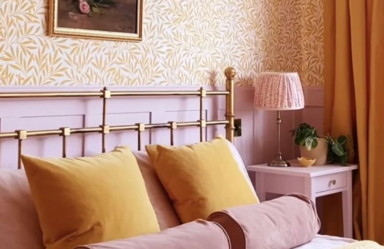 Soft pastel pink walls paired with a vibrant mustard velvet headboard generate a playful yet cozy atmosphere in this bedroom.